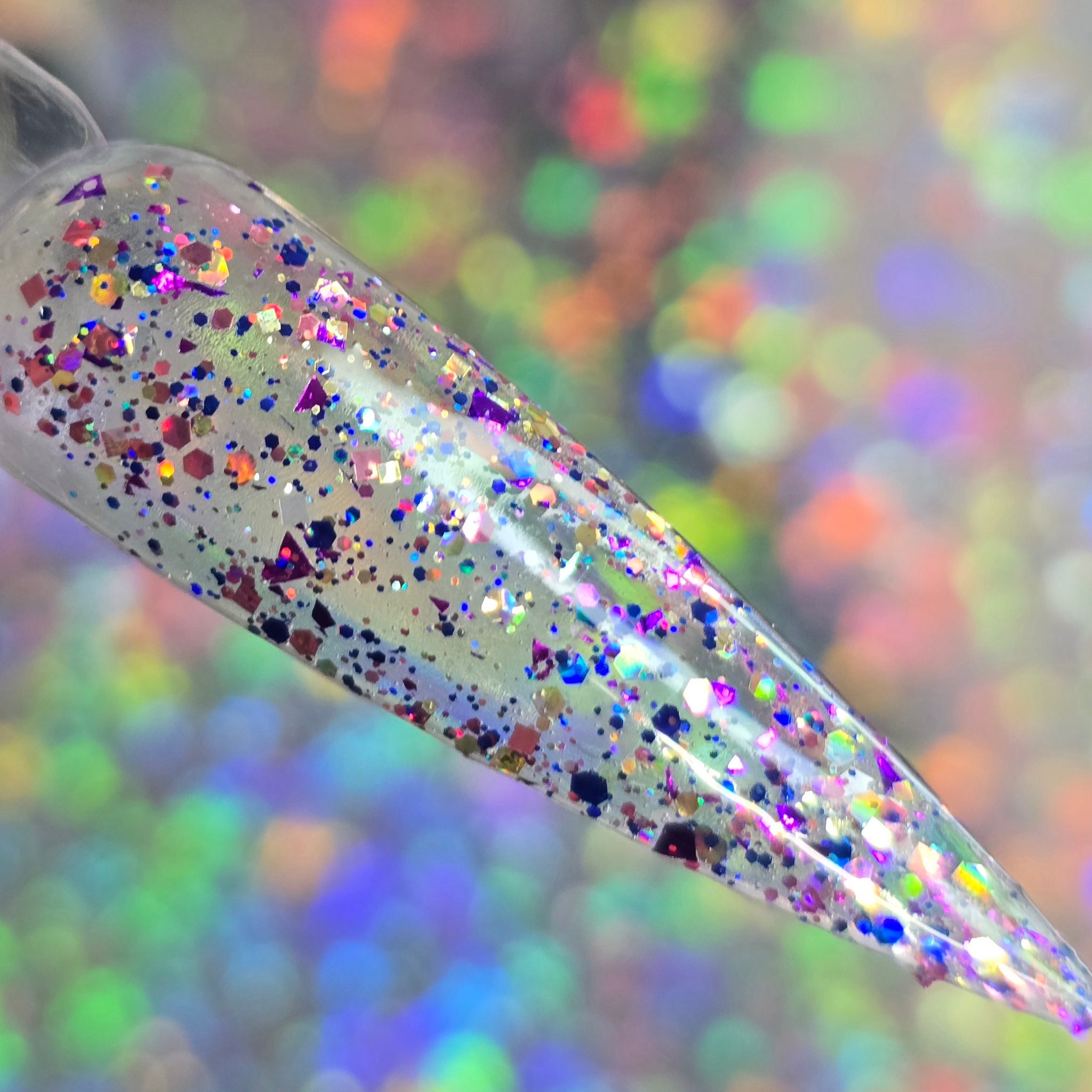 Holding the Galaxy in a Jar is a chunky topper with a mix of gold, silver, pink, blue, purple glitters.