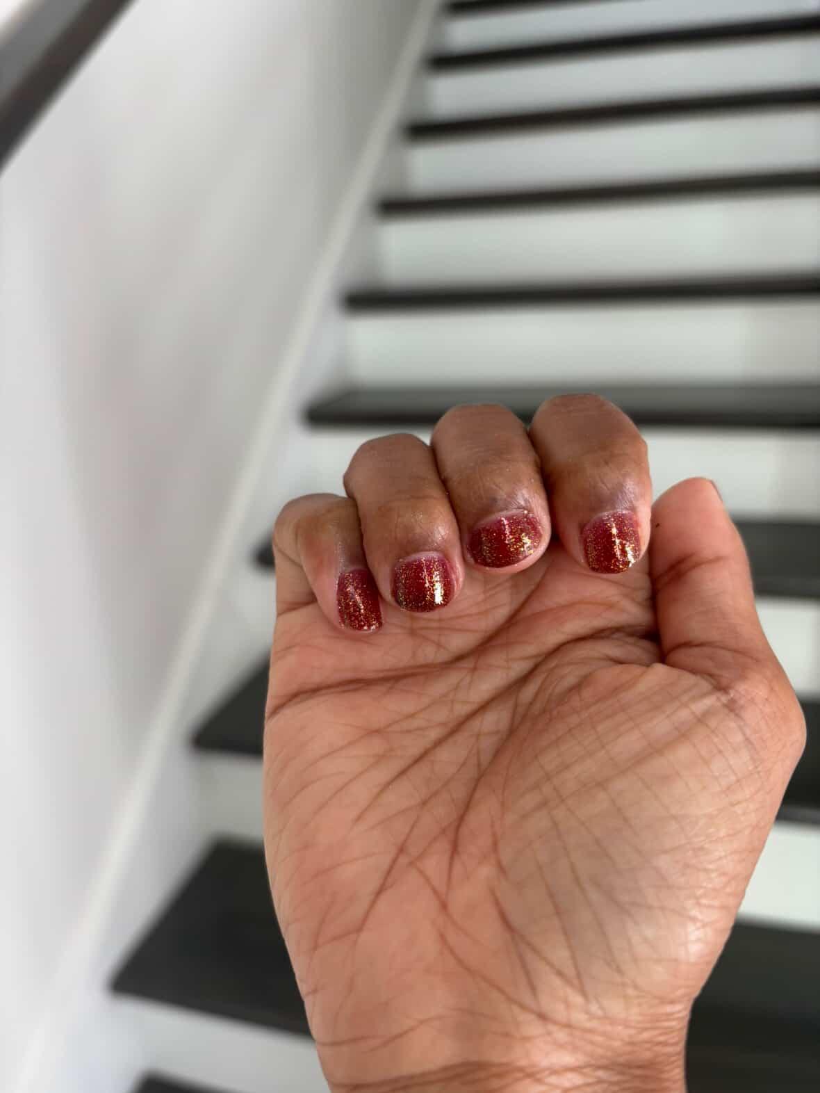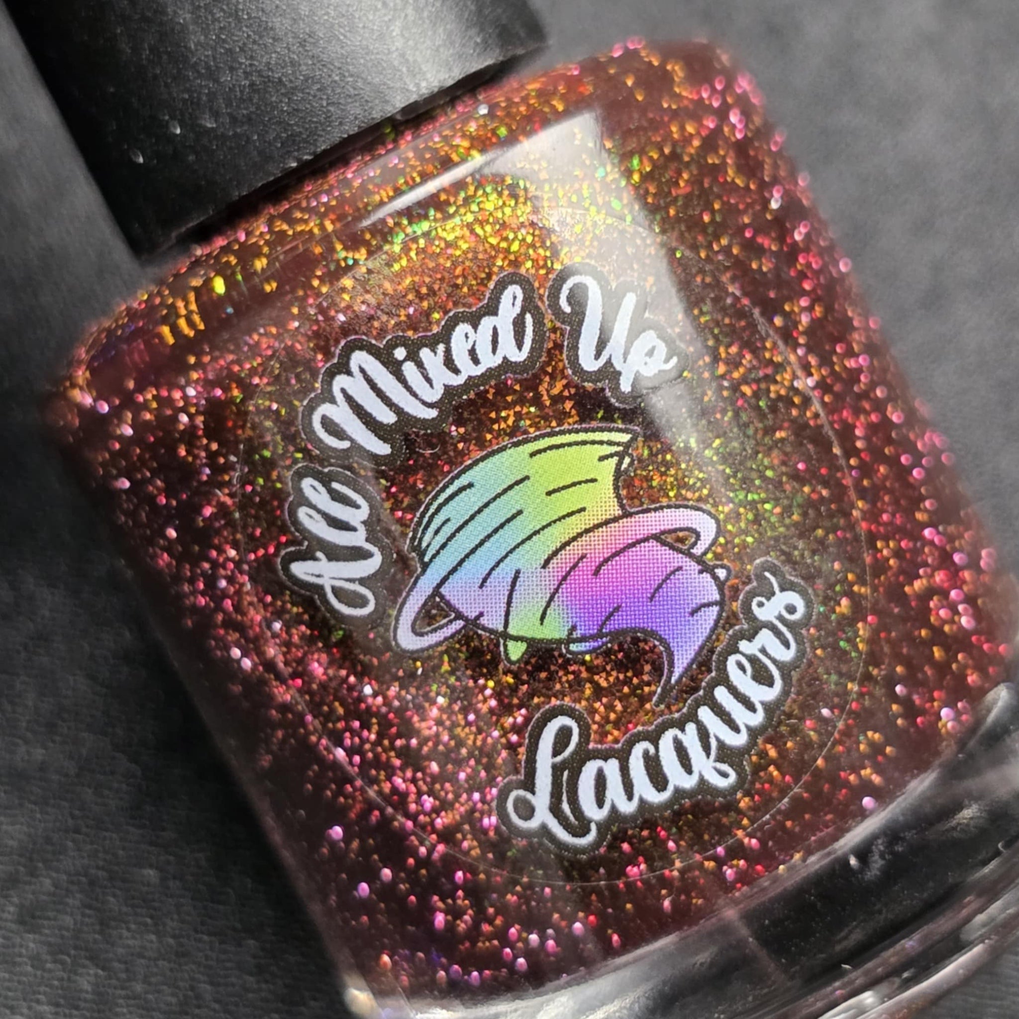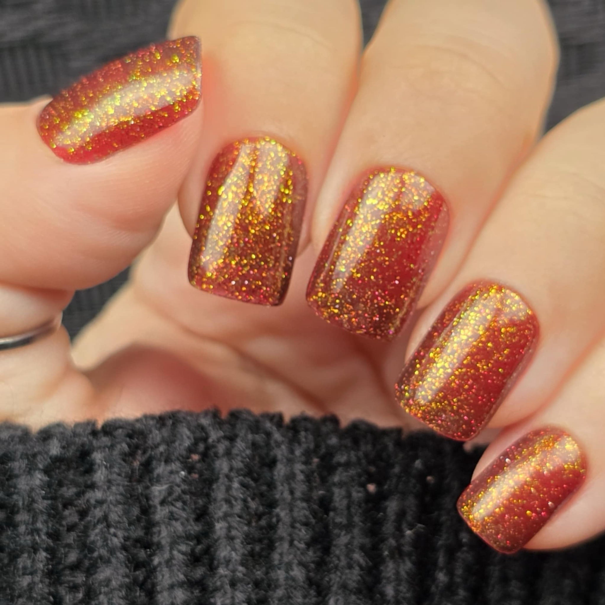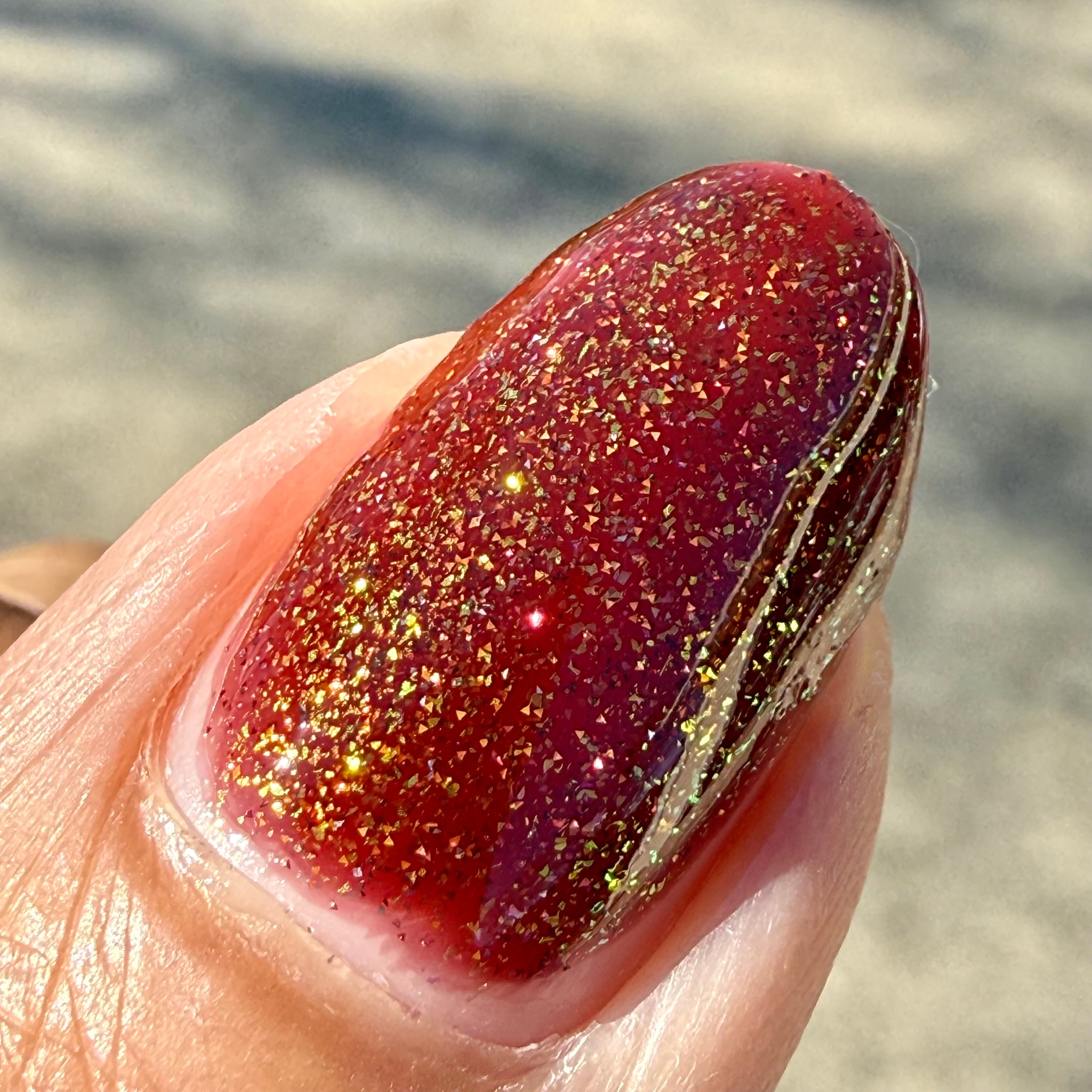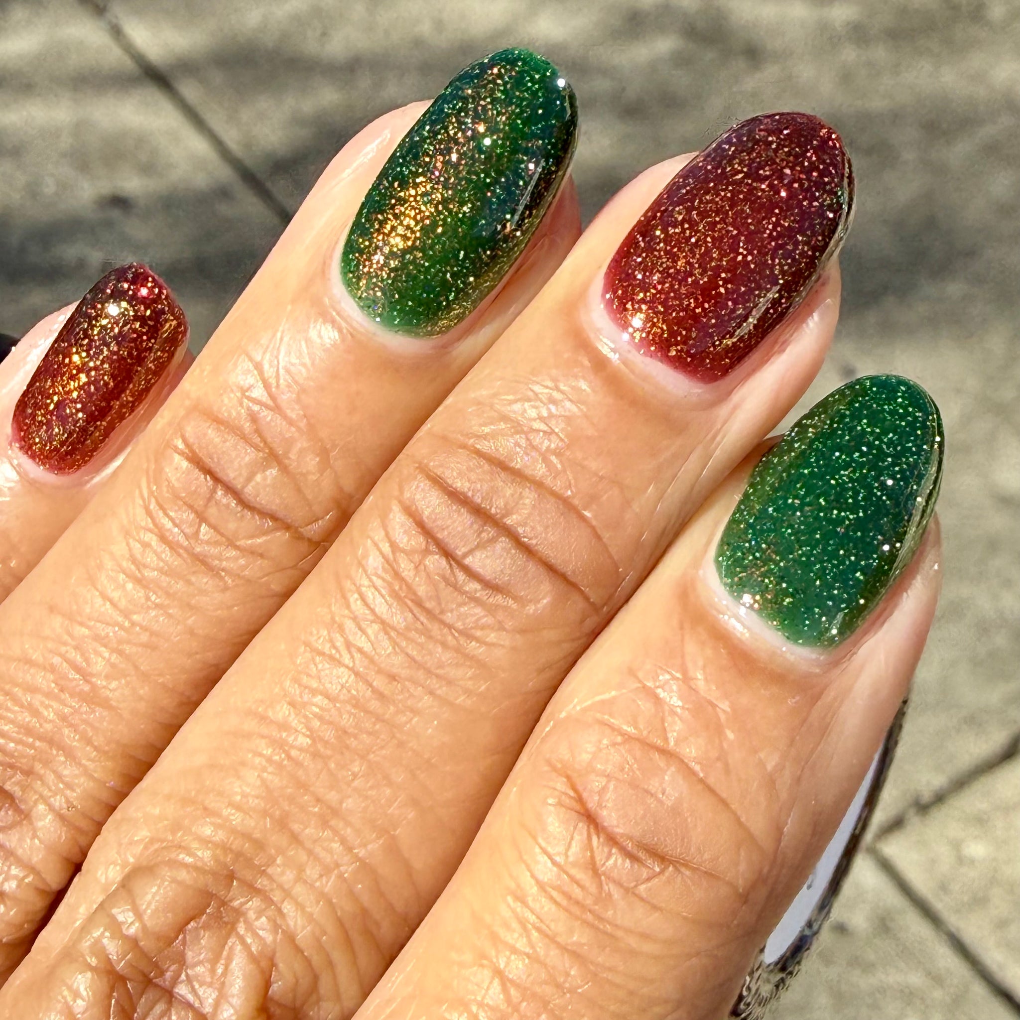 “Santa Needs a Drink” - a dingy brick red base with gold/copper/green shimmer and a scattering of reflective glitter.