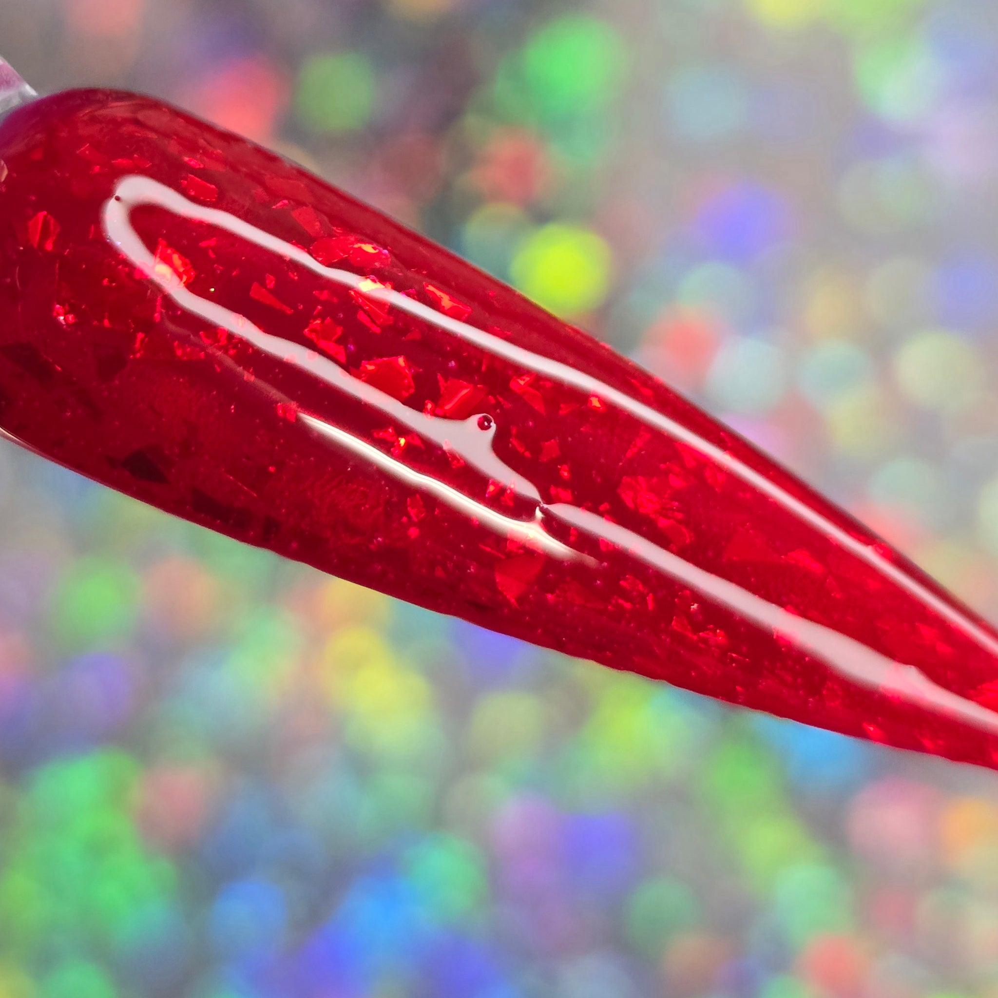 It's Gotta Be RED! IS a bold red jelly base with red holographic glitters and flakes.