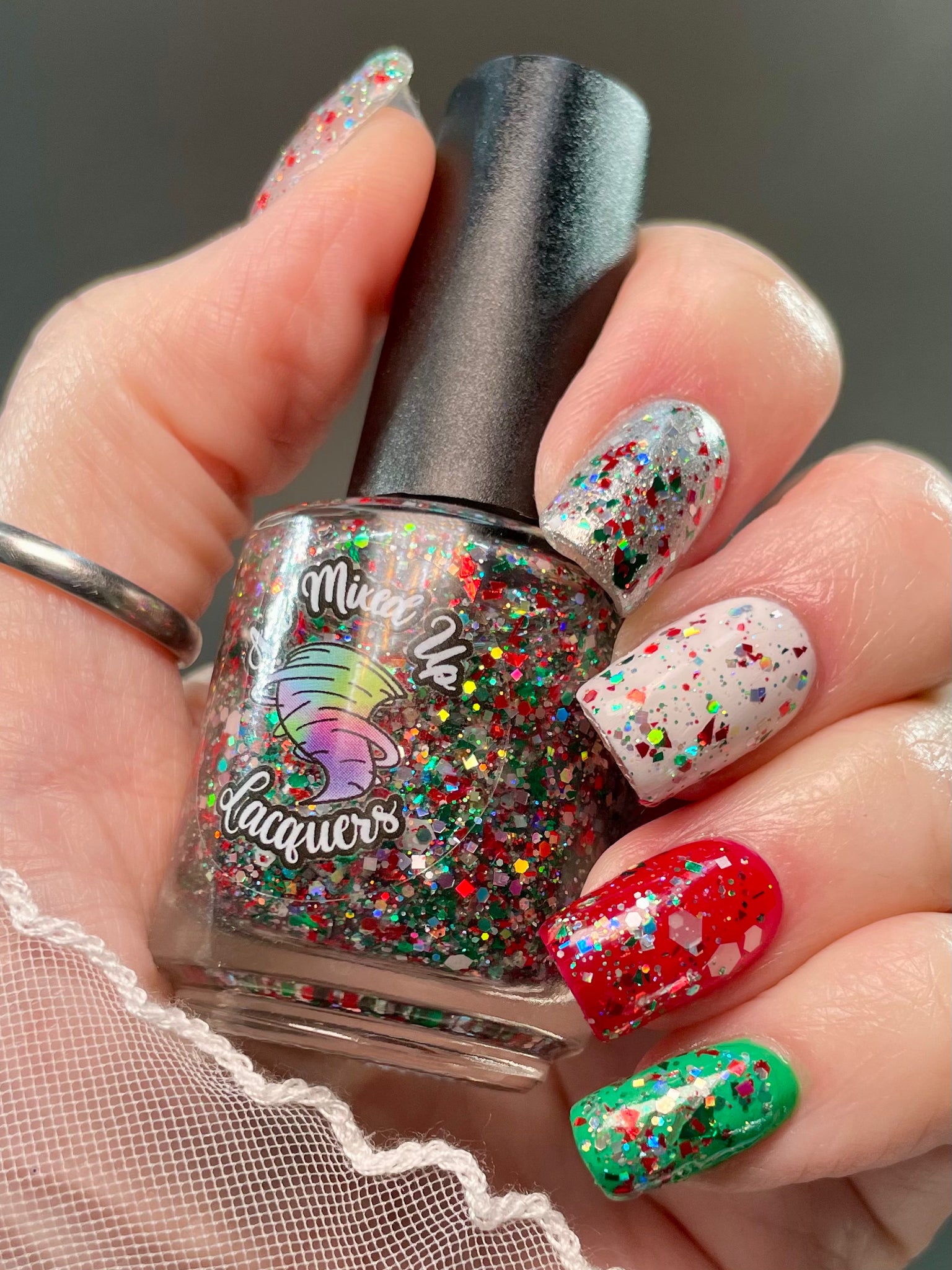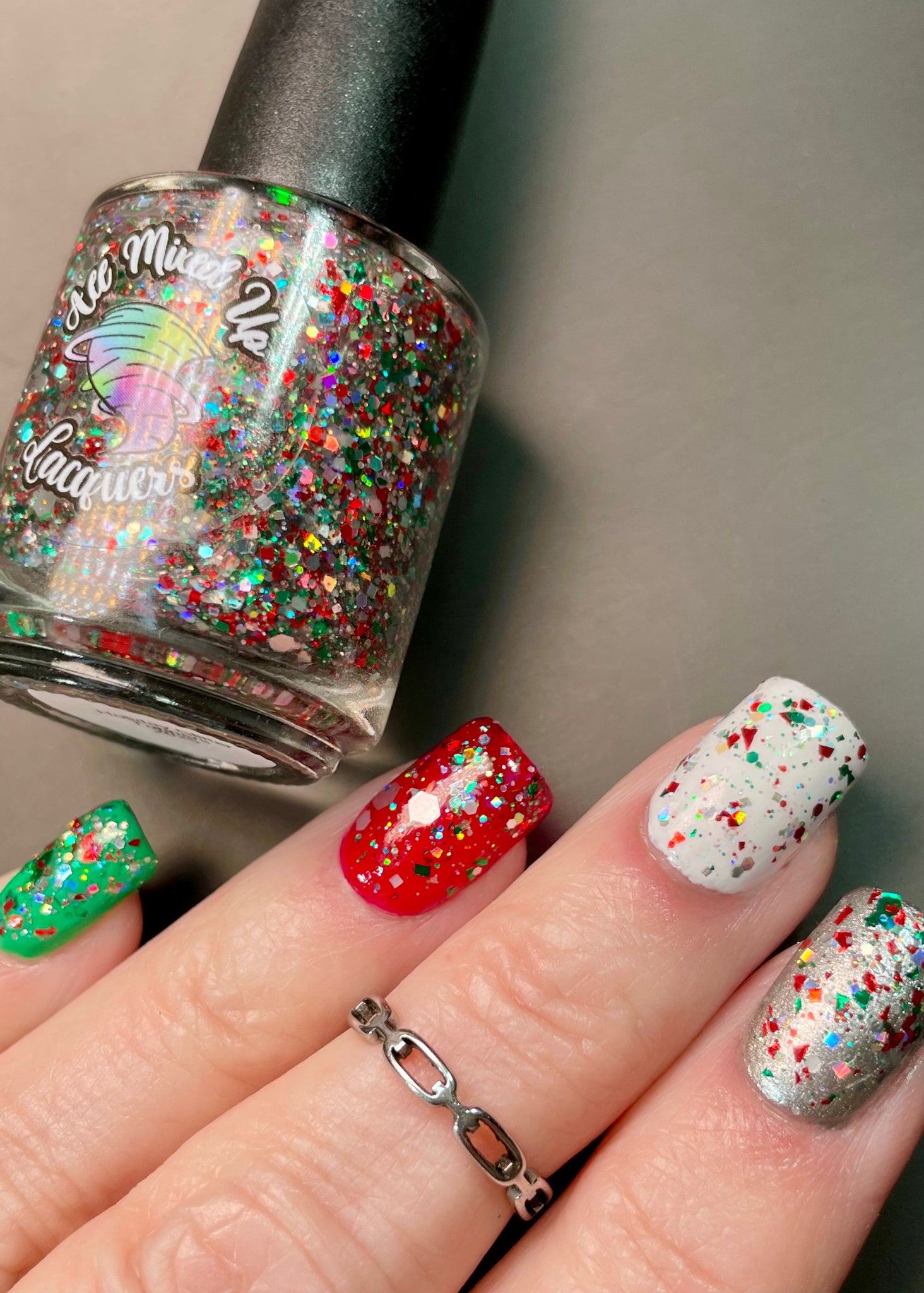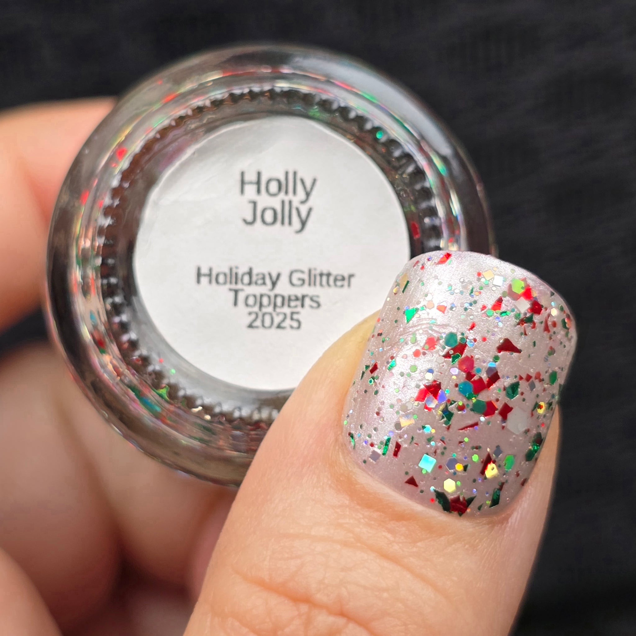 “Holly Jolly” - a chunky glitter topper with a mixture of red, green, silver, and white glitters in holographic, metallic, and matte.