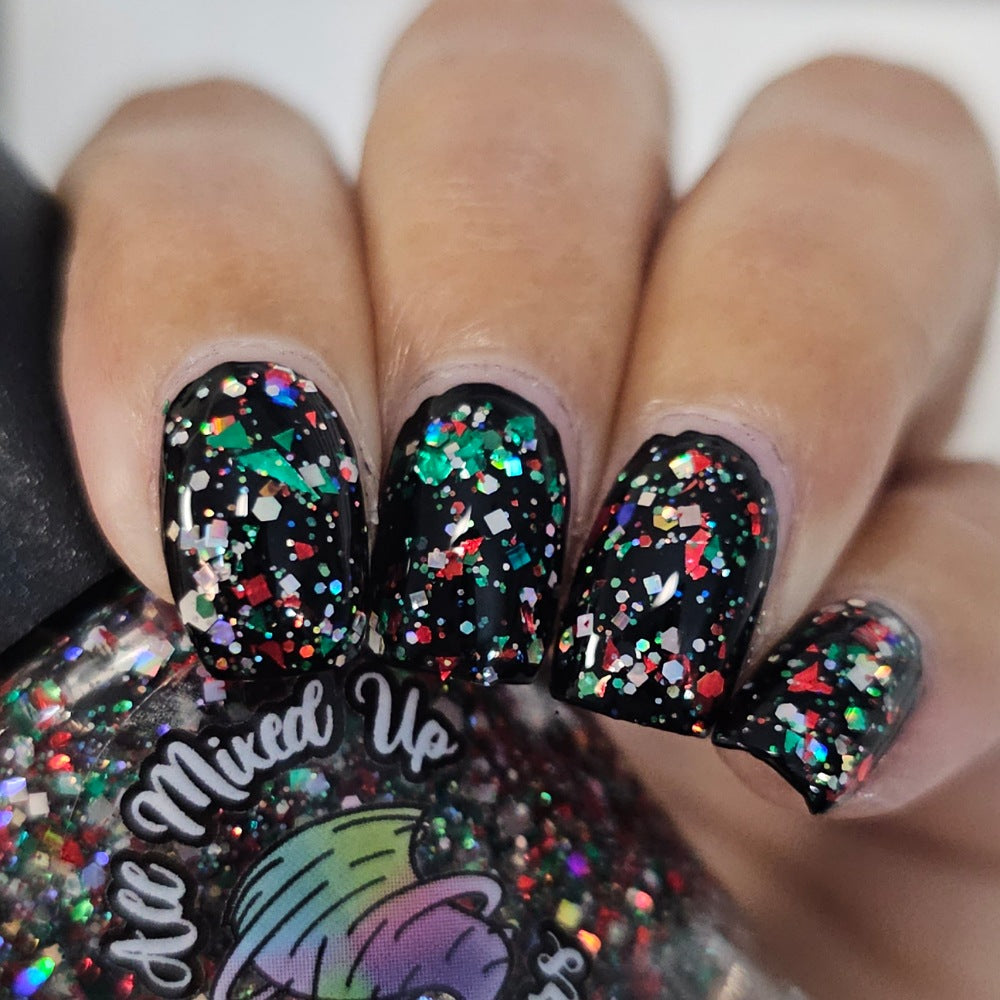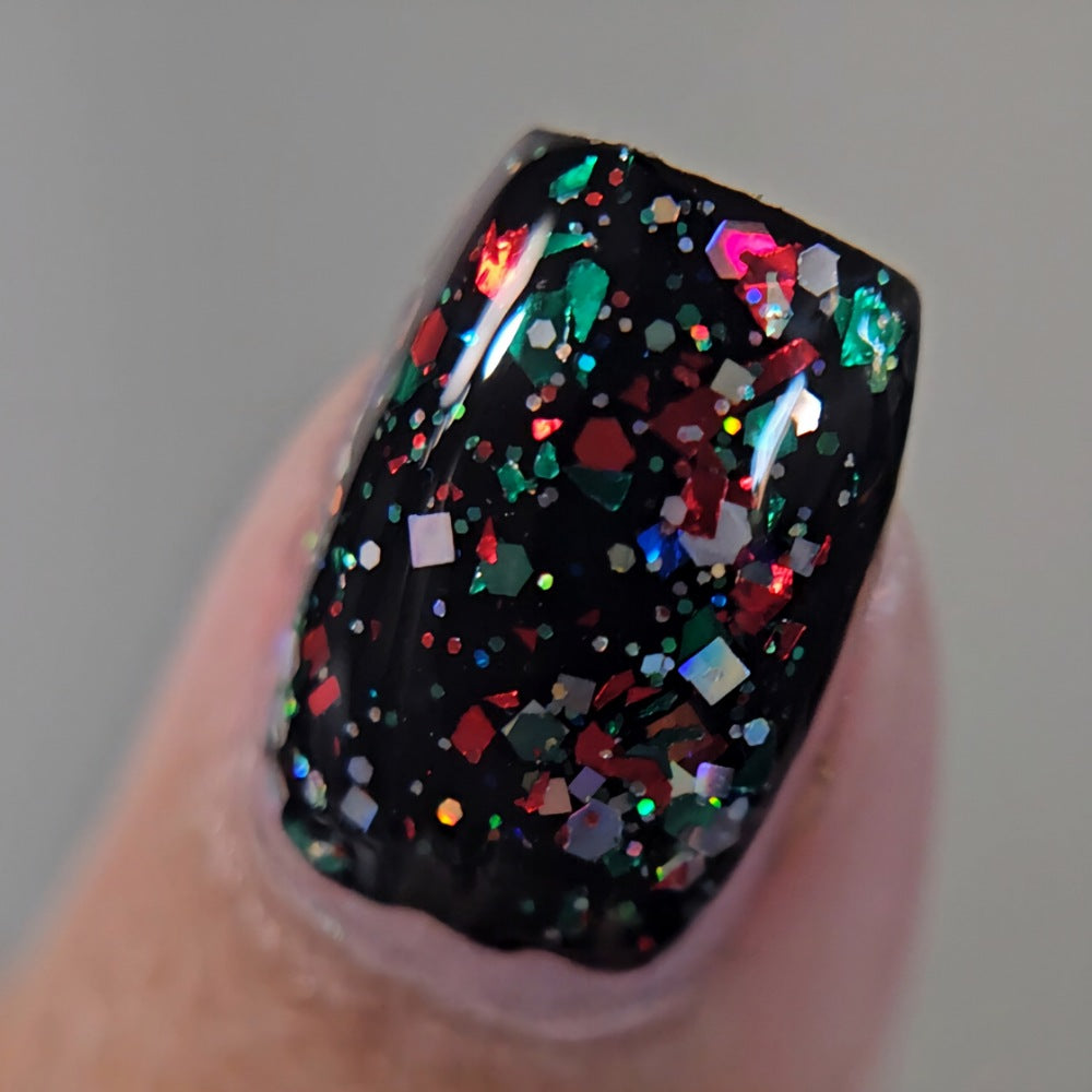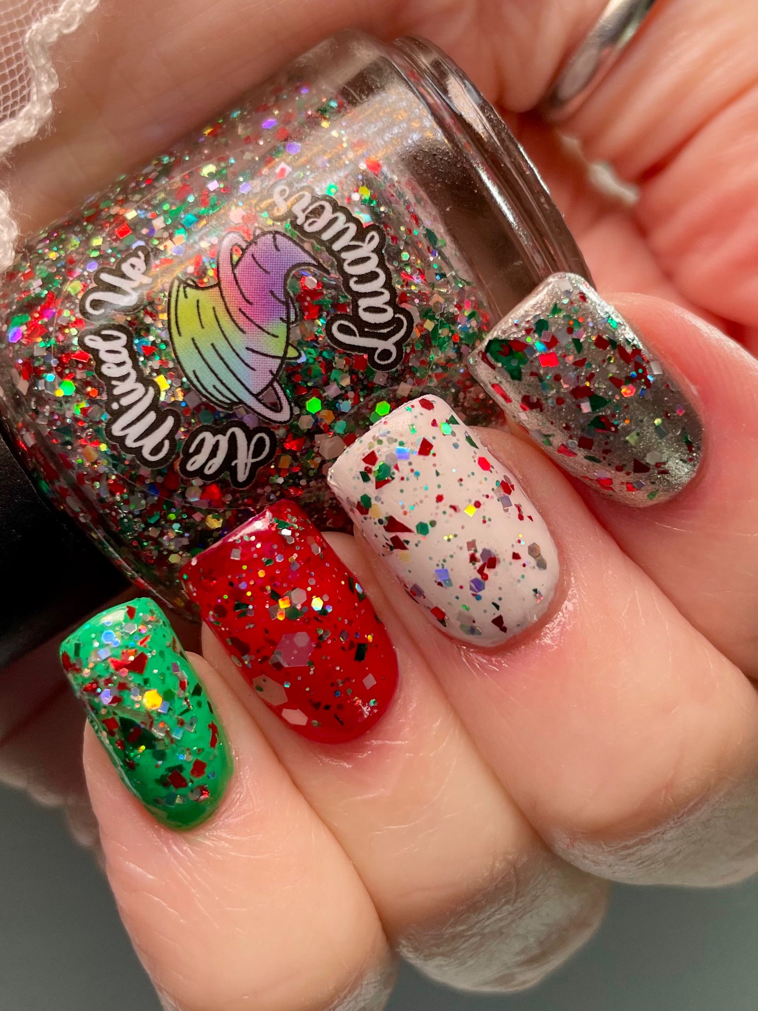 “Holly Jolly” - a chunky glitter topper with a mixture of red, green, silver, and white glitters in holographic, metallic, and matte.