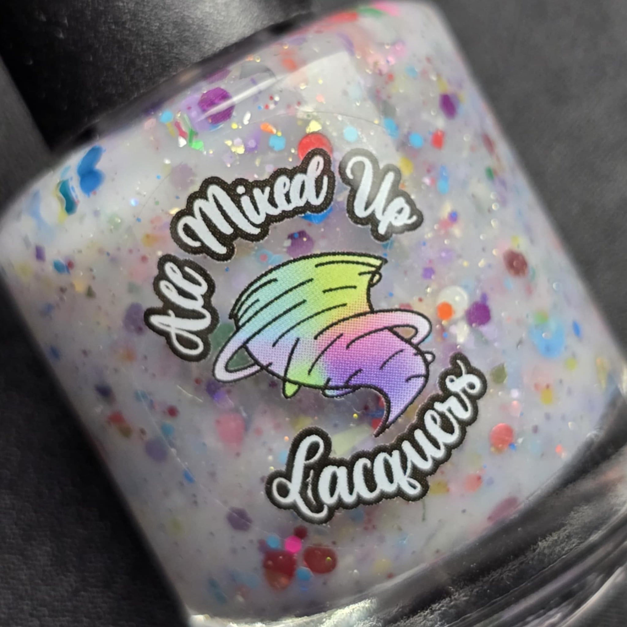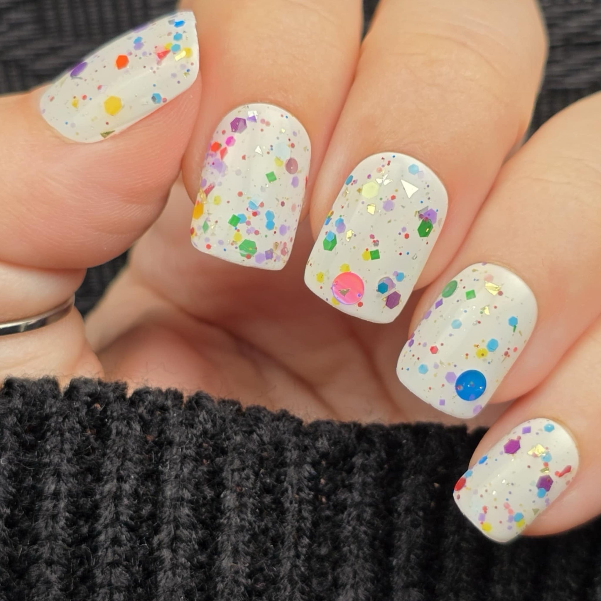 “Everything but the Kitchen Sink”- a sheer white crelly with a multitude of colorful glitters in all different size and shape
