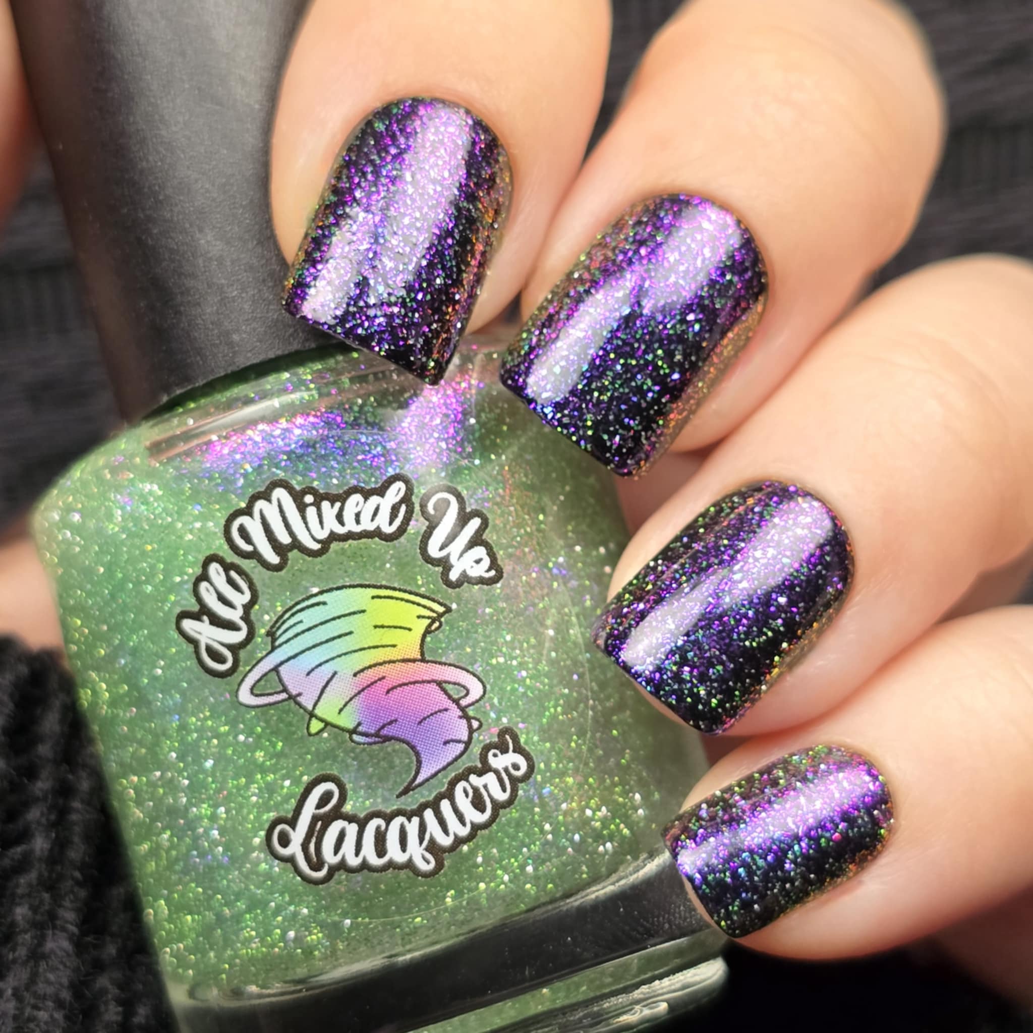 “Chaos Concoction” - a topper with green and silver reflective glitter and blue/green/pink/gold shimmers at different angles.