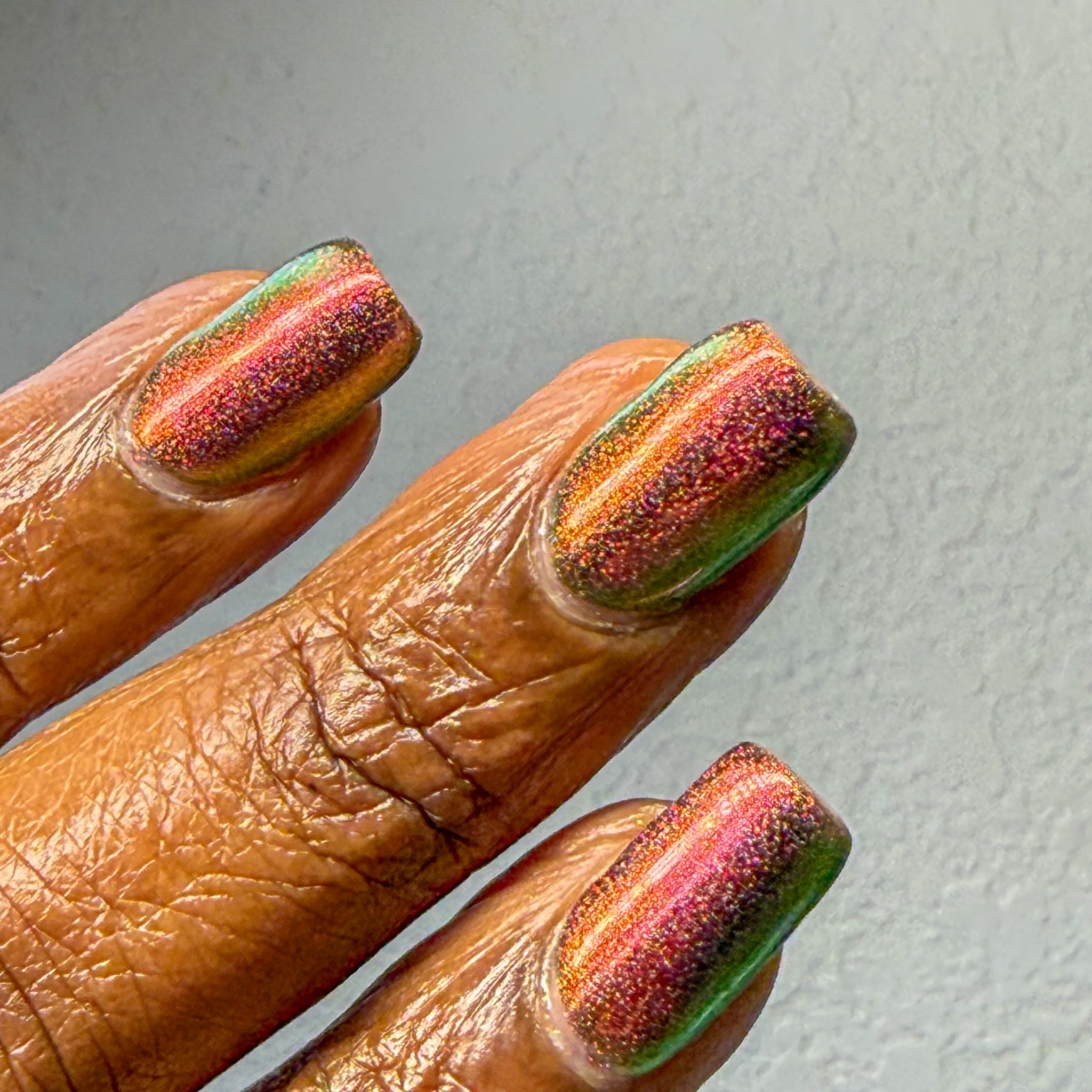 “Rust in Peace” - a scattered holographic multichrome with a copper/gold/green shift.