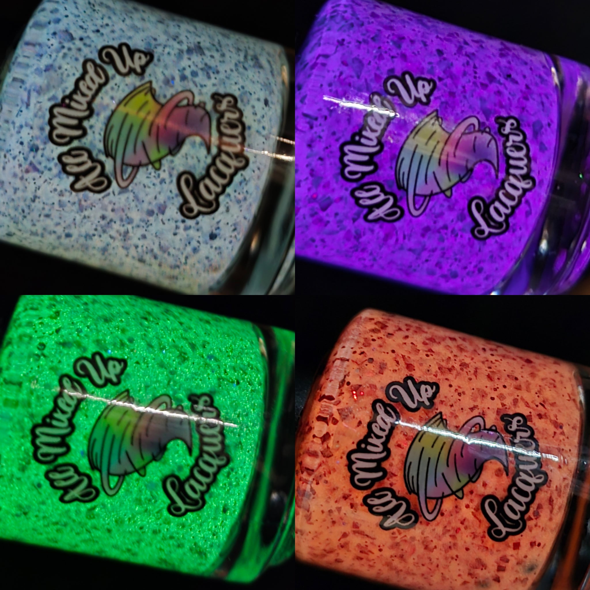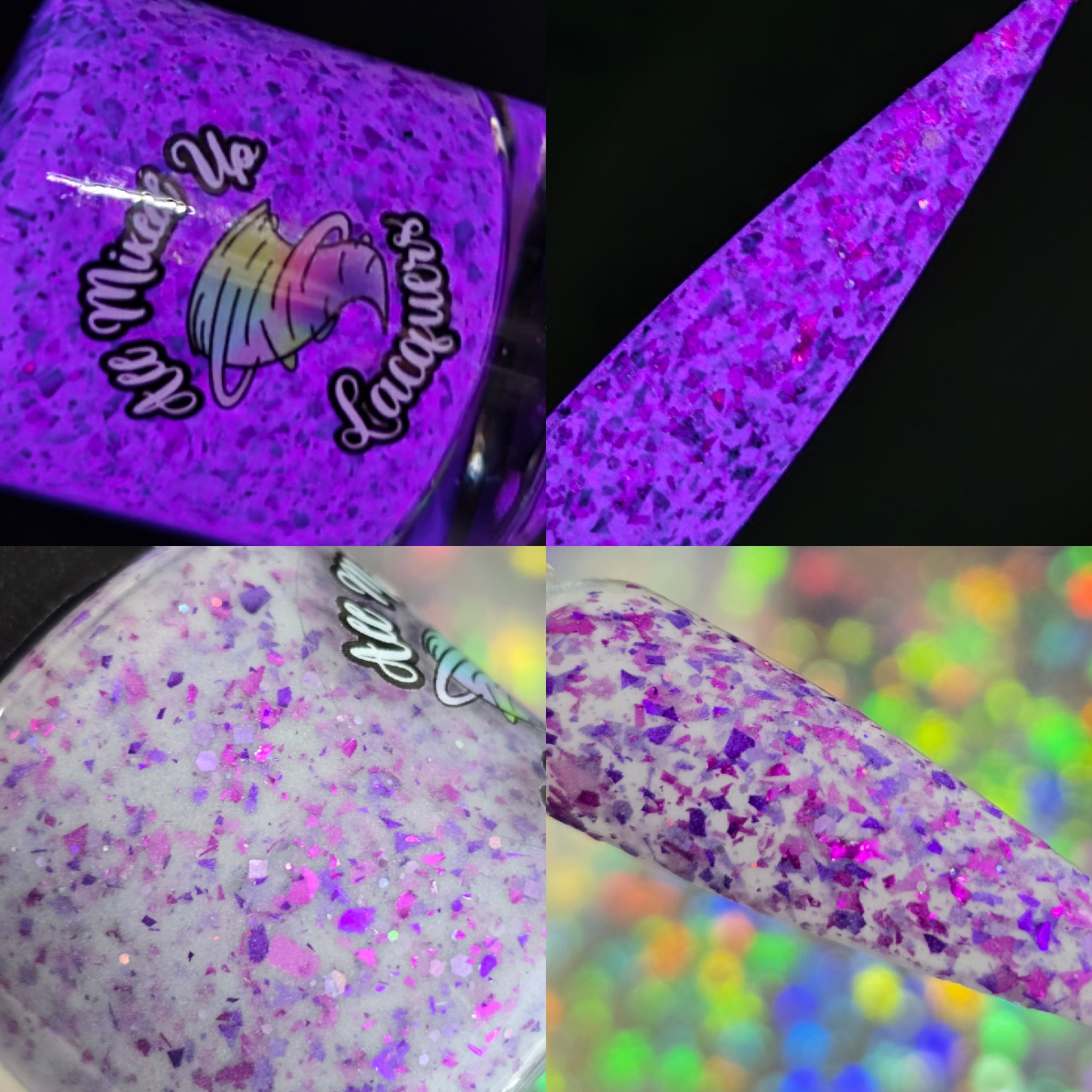 "Witch" is a white bright purple glow in the dark base with assorted purple glitters