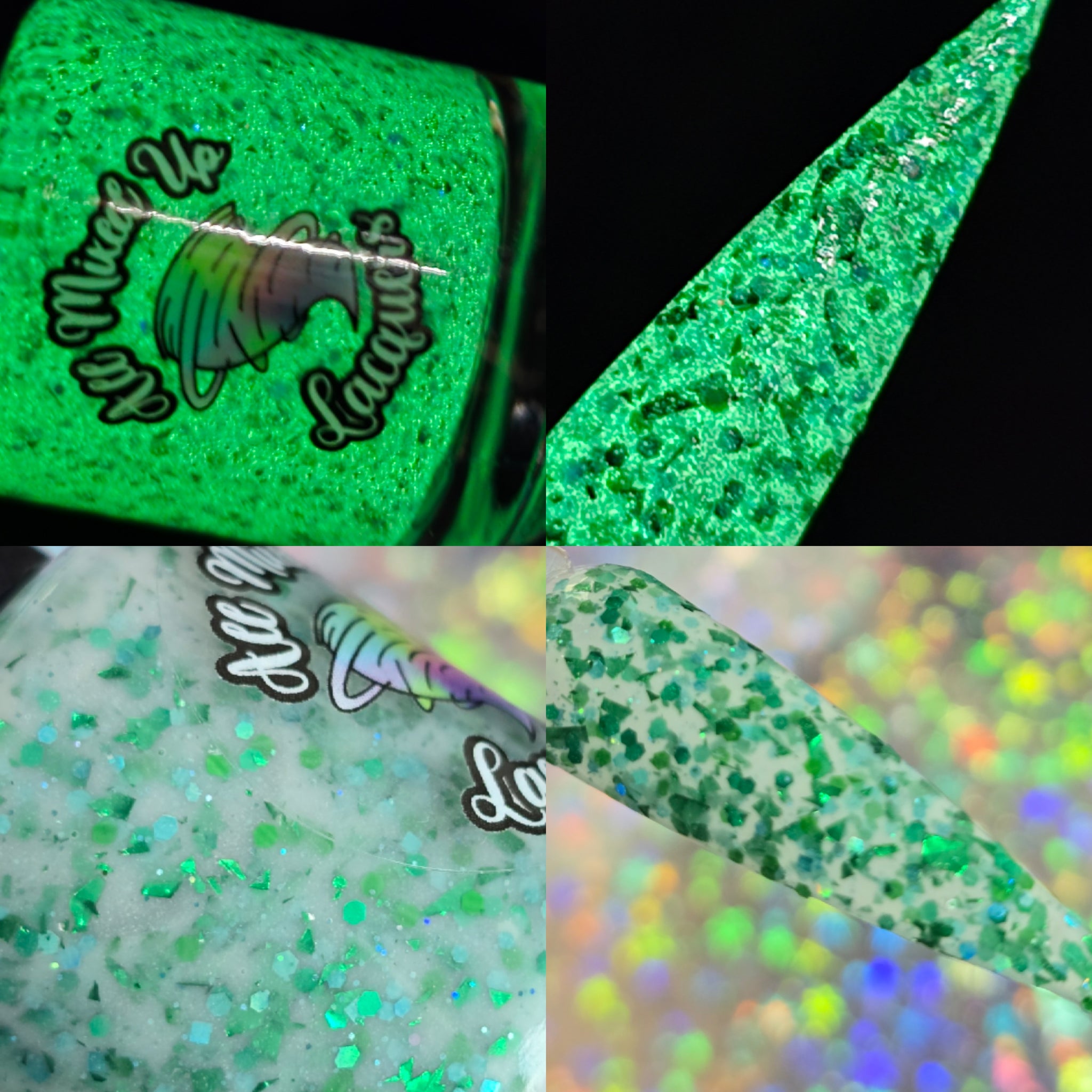 "Zombie" is a white neon green glow in the dark base with assorted green glitters