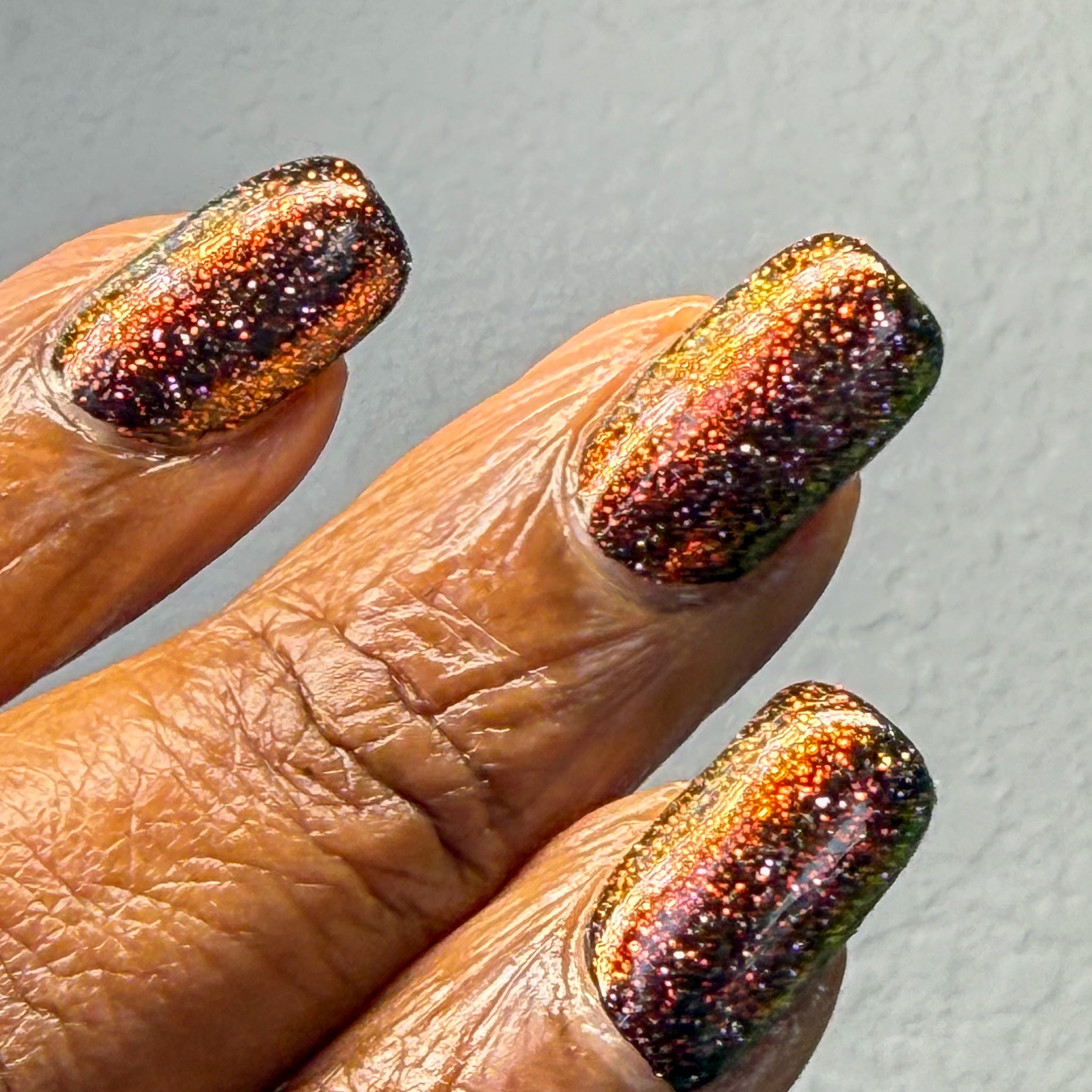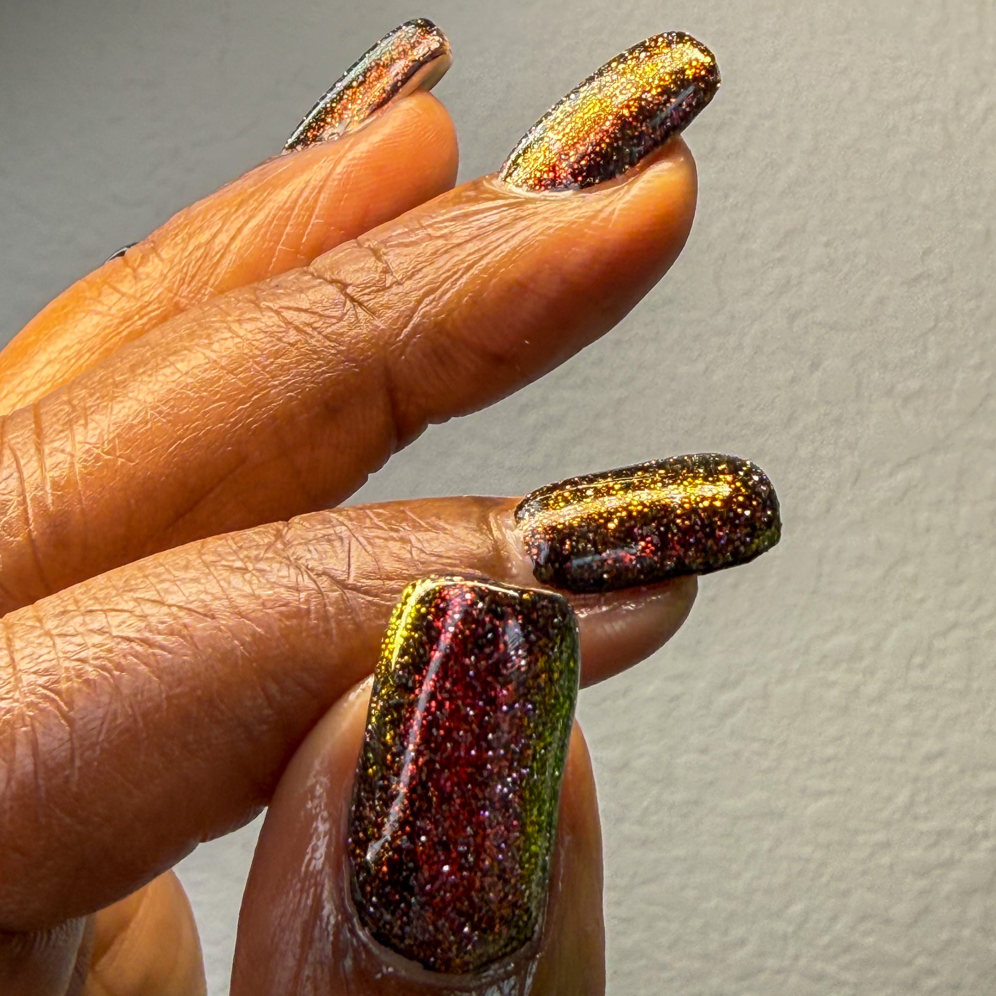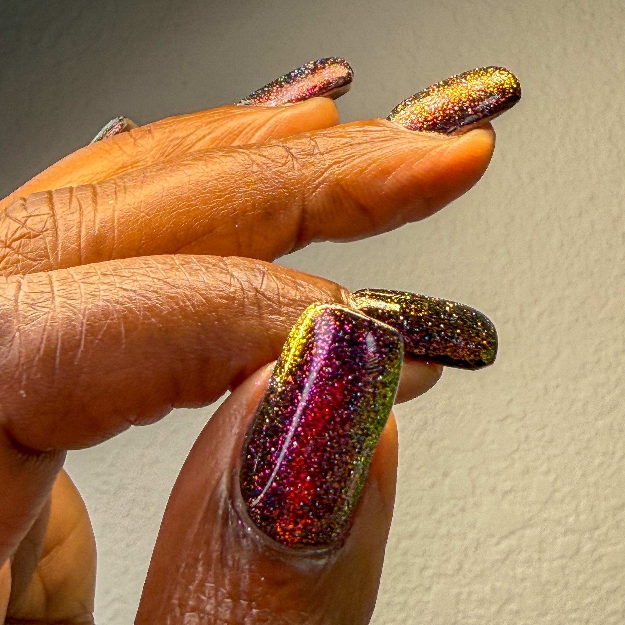 The shimmer effects will be different depending on the base shade. Black will bring out the most color shifts and different color shades can intensify certain colors in the shimmer shifts.