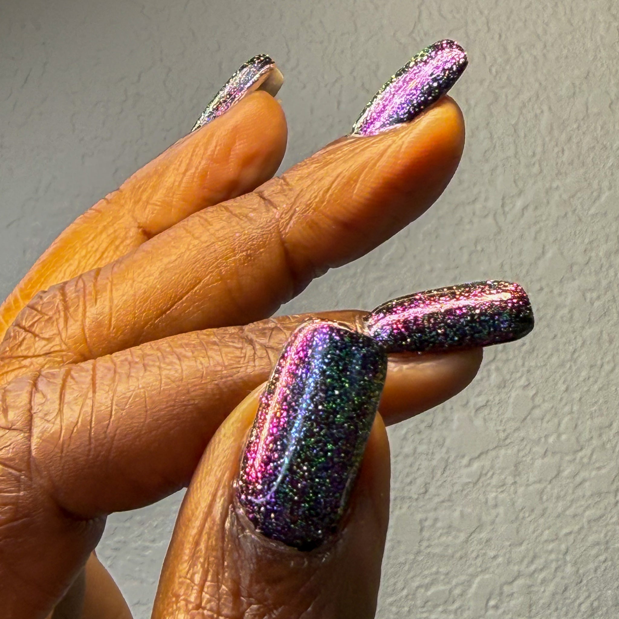 “Bottled Magic” - a topper with pink and silver reflective glitters and green/blue/purple/pink shimmers at different angles.