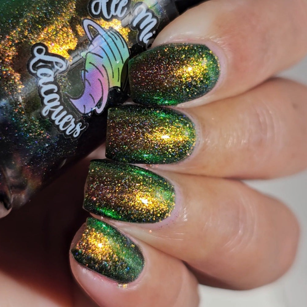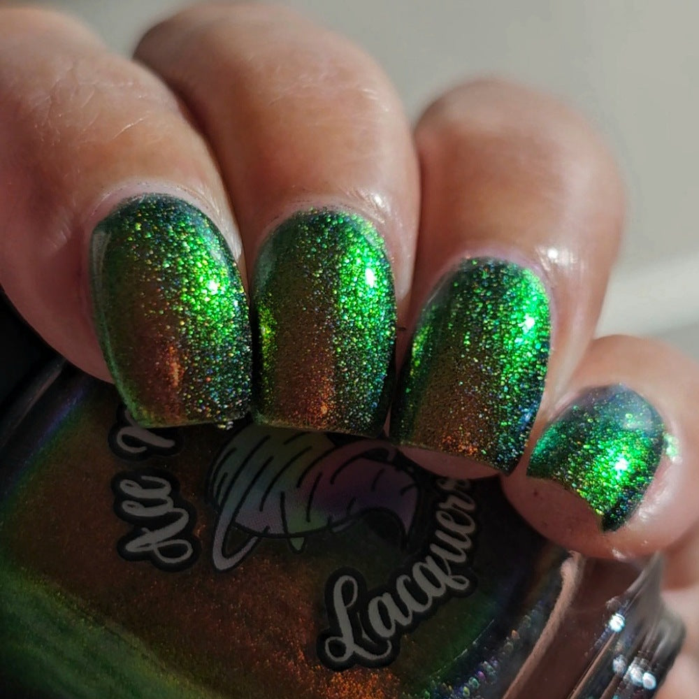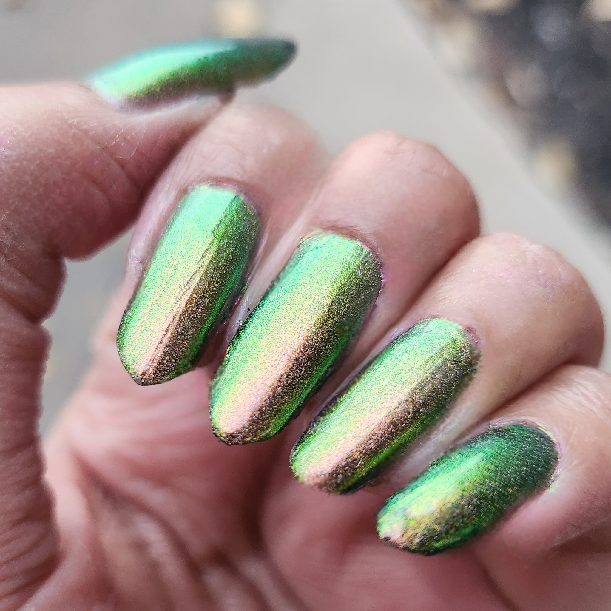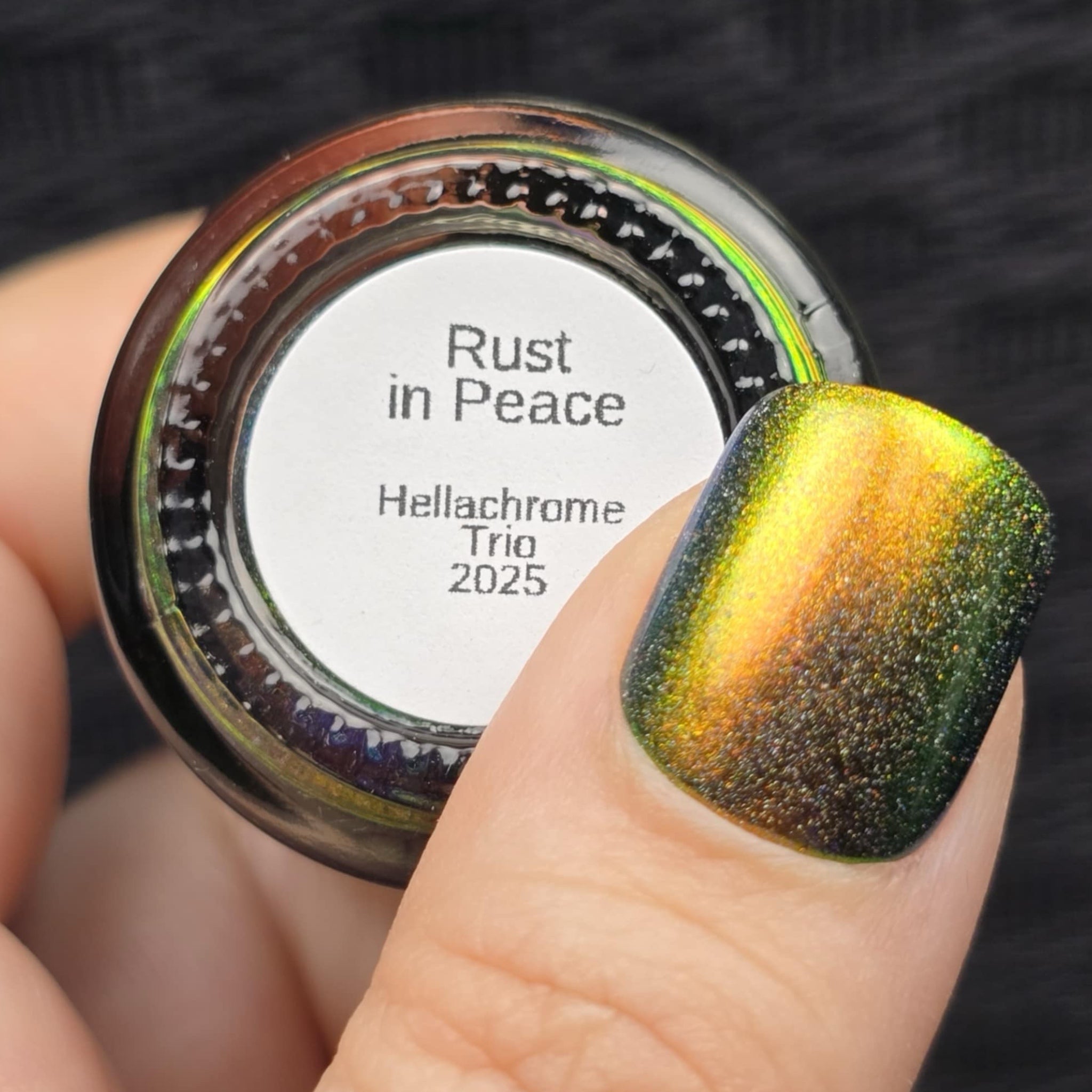 “Rust in Peace” - a scattered holographic multichrome with a copper/gold/green shift.