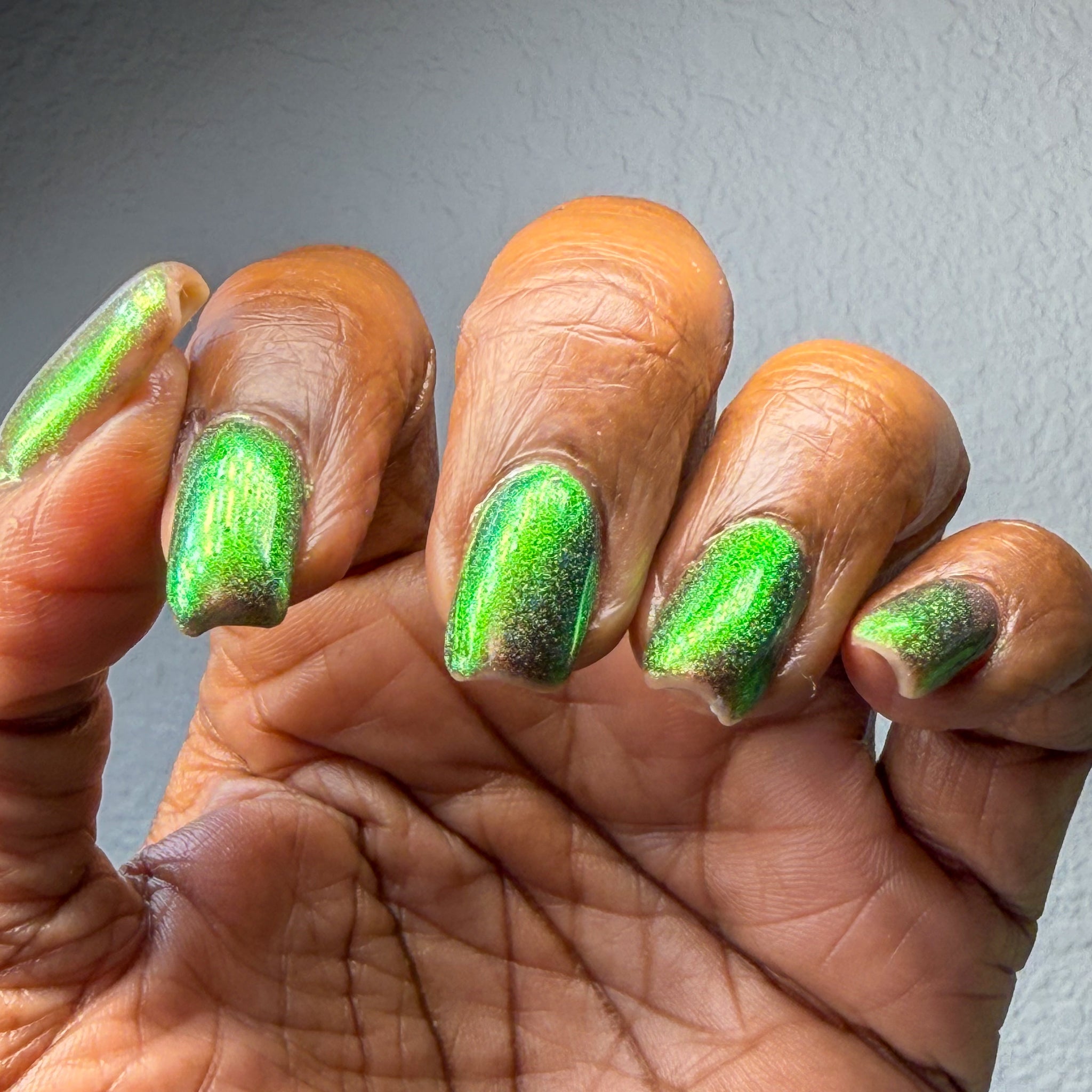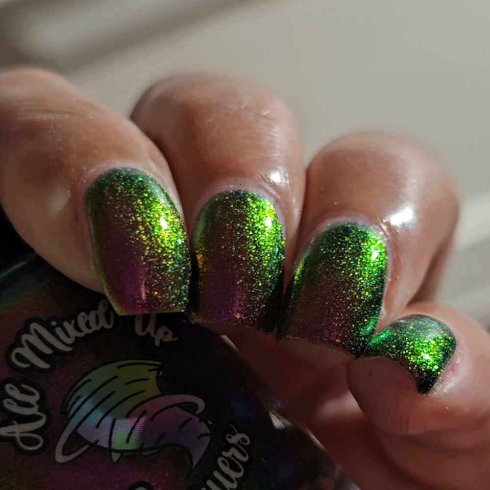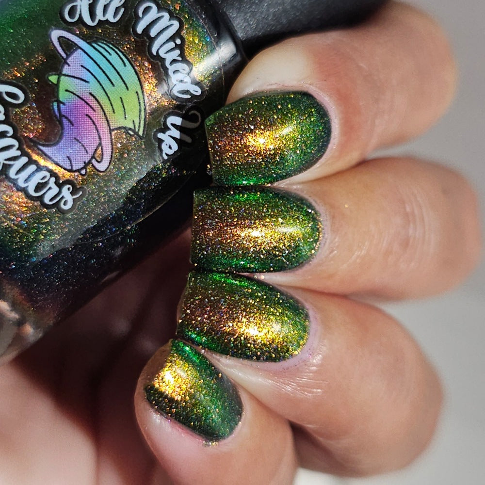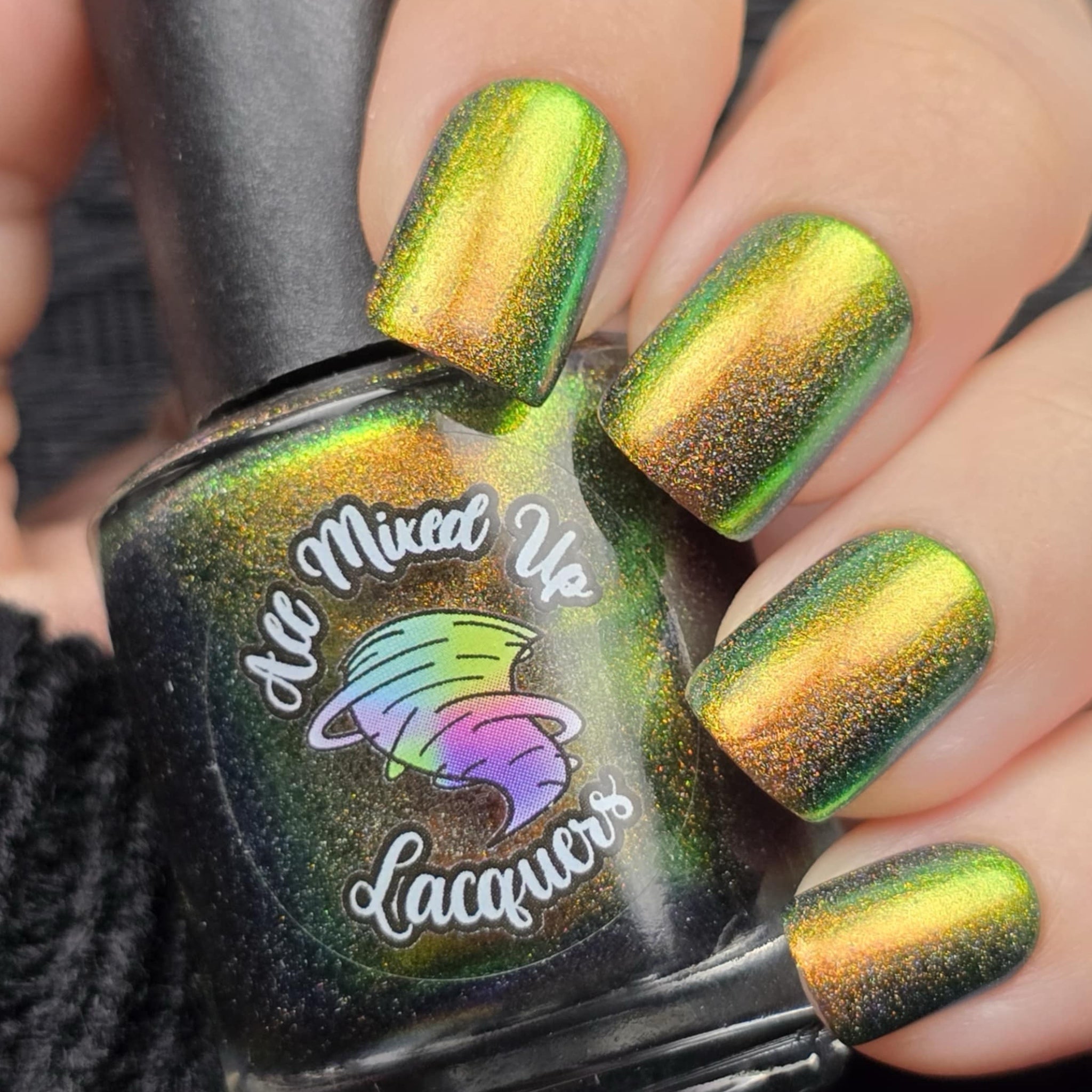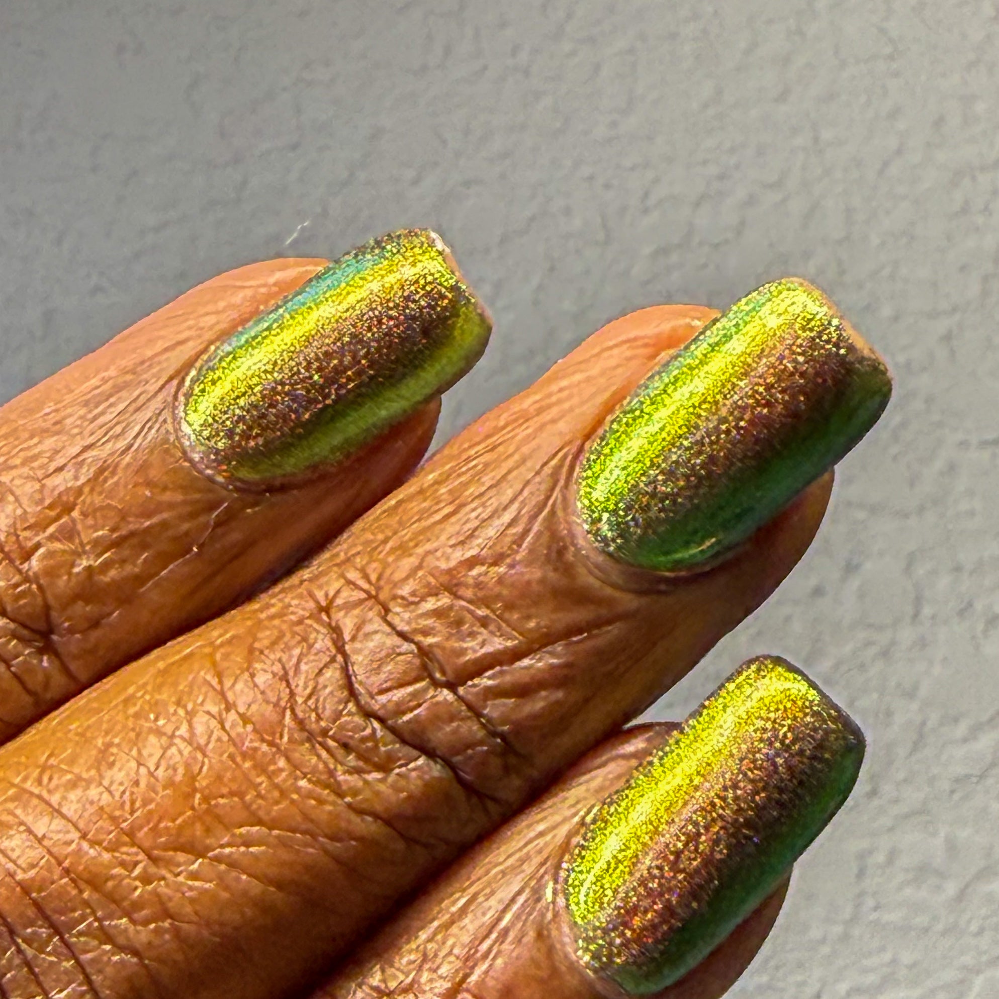“Rust in Peace” - a scattered holographic multichrome with a copper/gold/green shift.