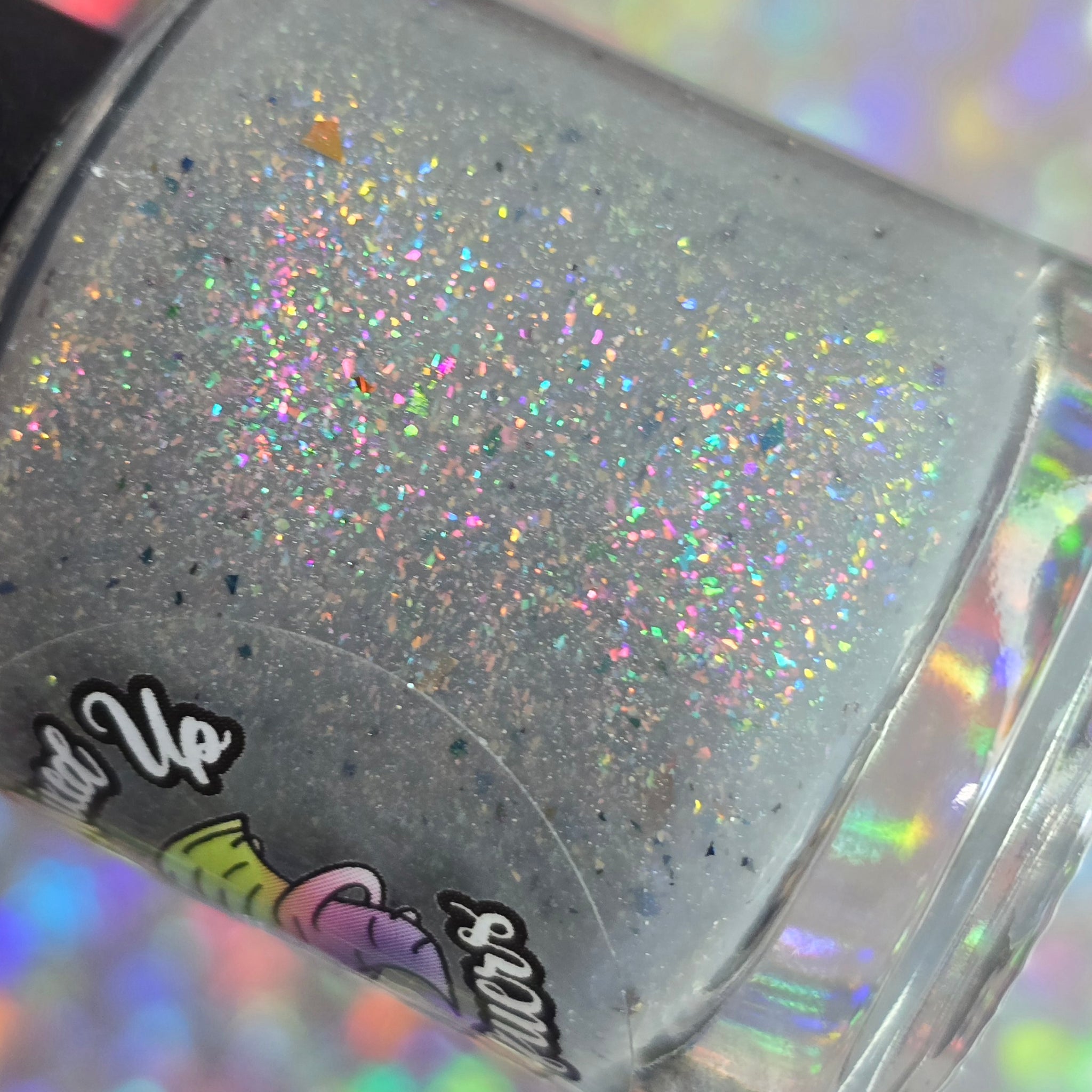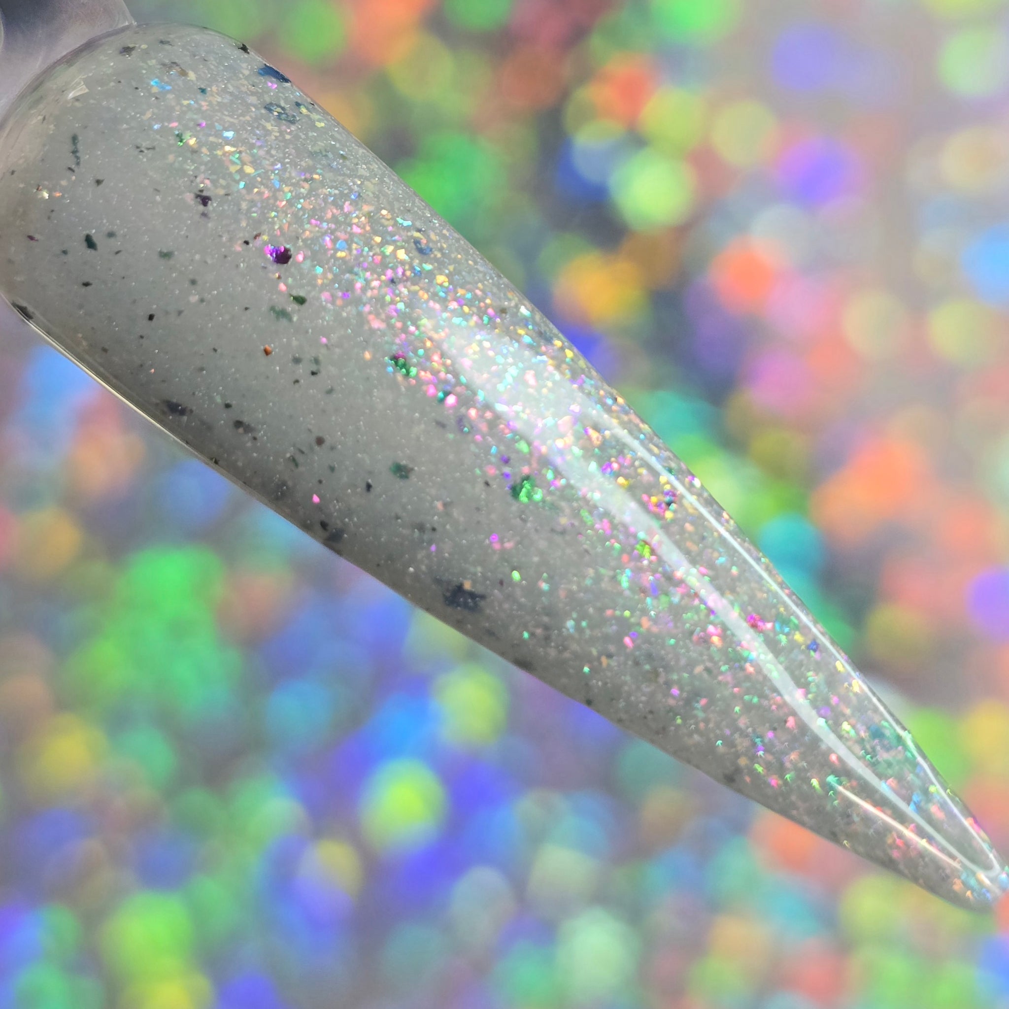 Seal Kisses - a light grey crelly with multiple different ucc flakes and shifting shimmers.