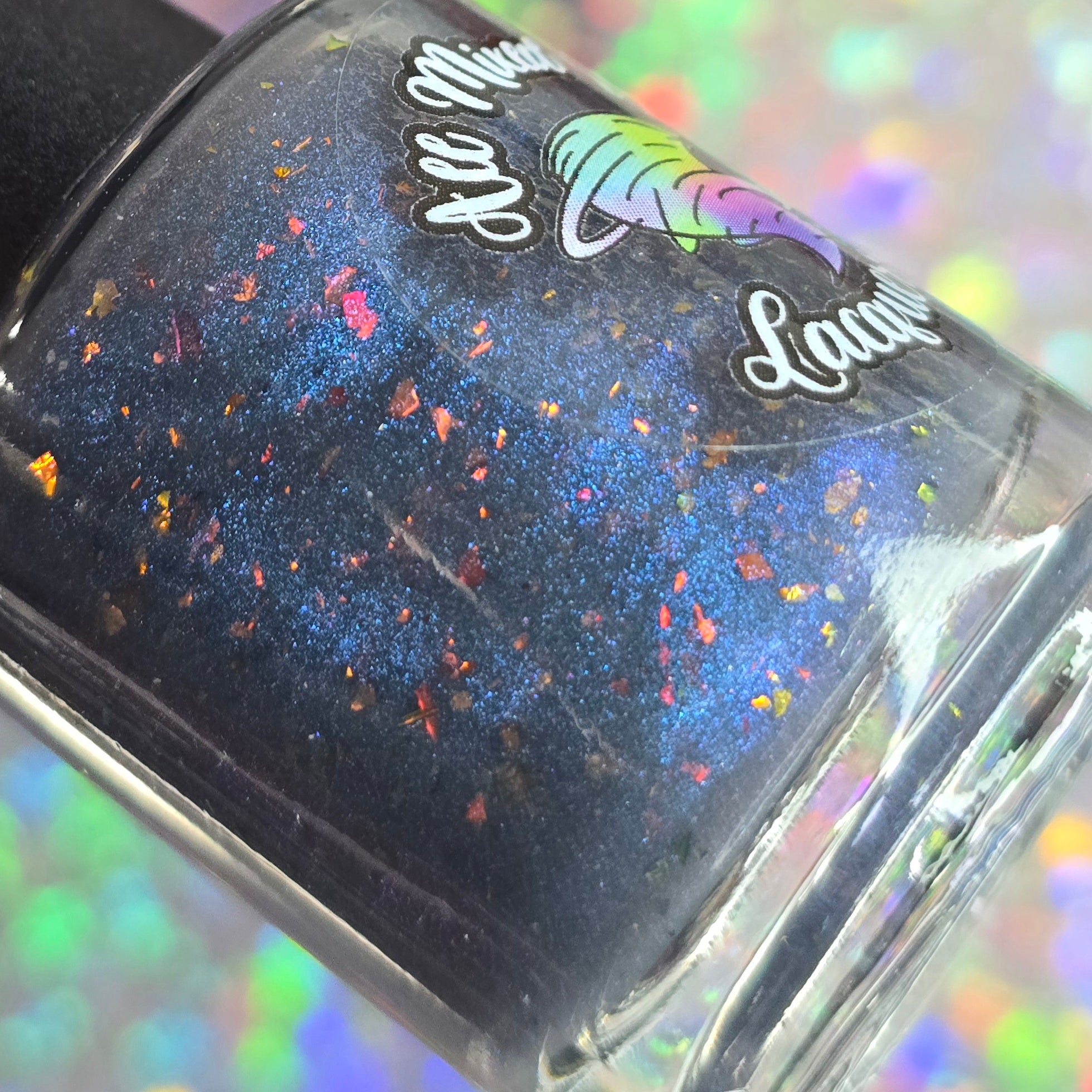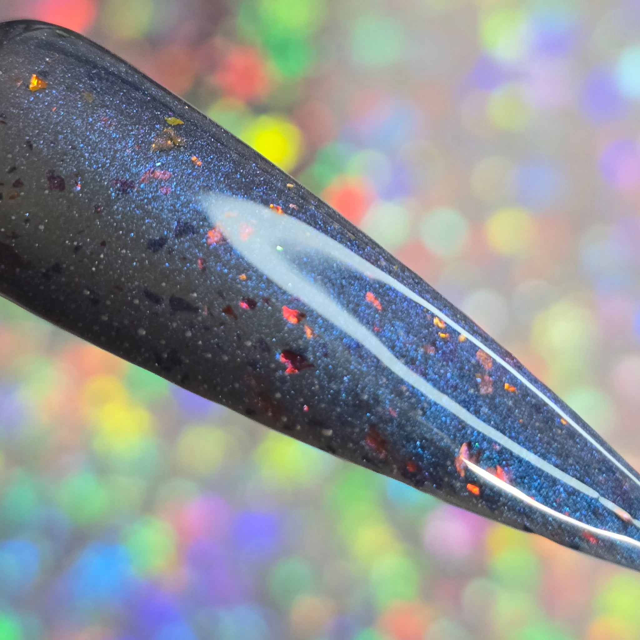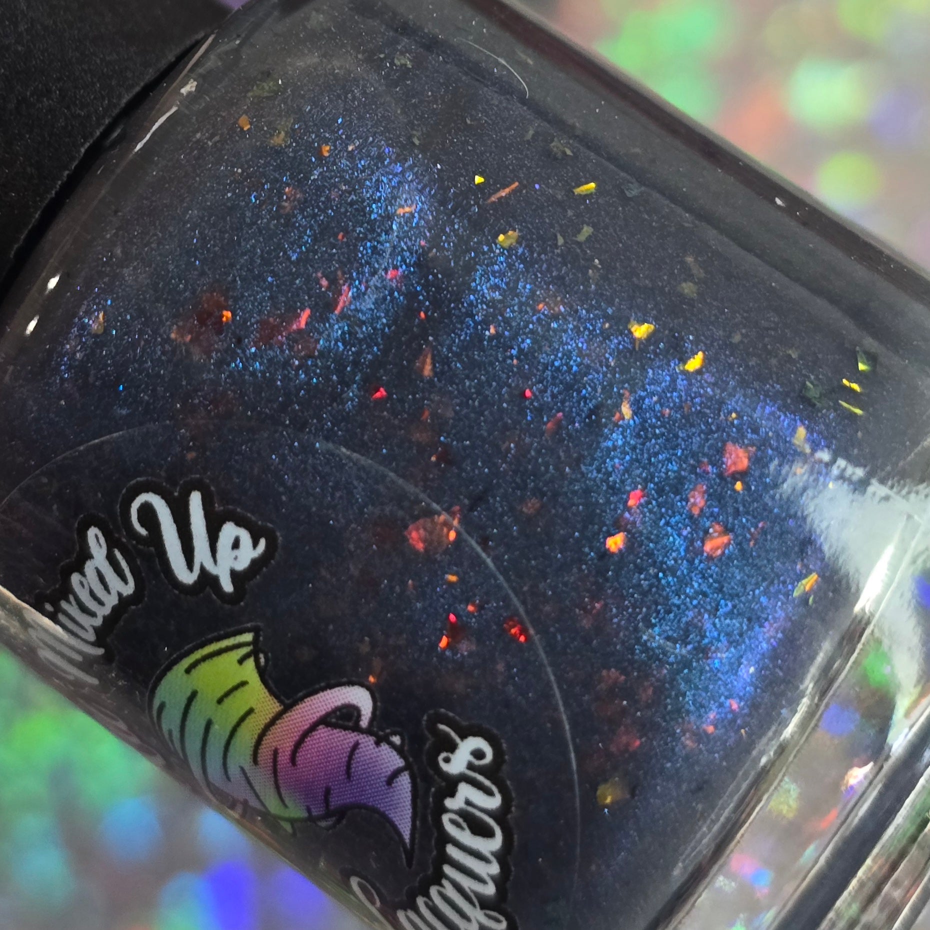 Something in the Air is a dusty sheer black base with blue shimmer and red/copper/gold ucc flakes